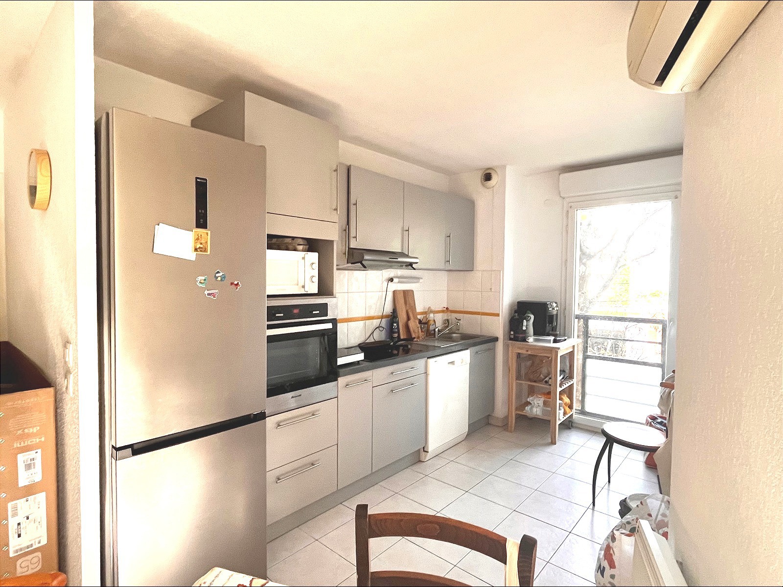 La cuisine est aménagée et équipée, s'intégrant parfaitement dans l'espace pour une utilisation fonctionnelle